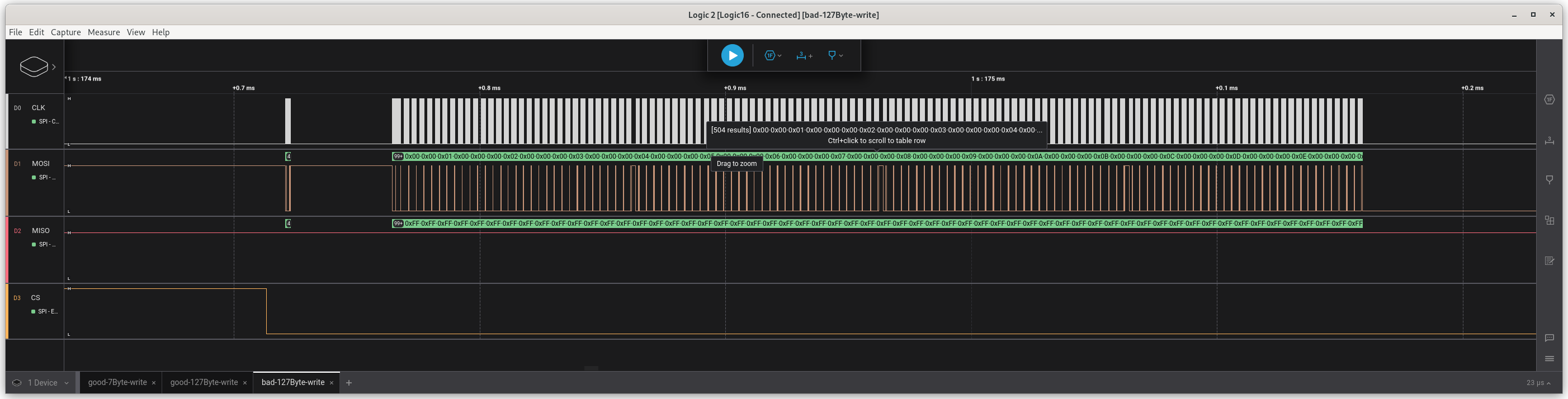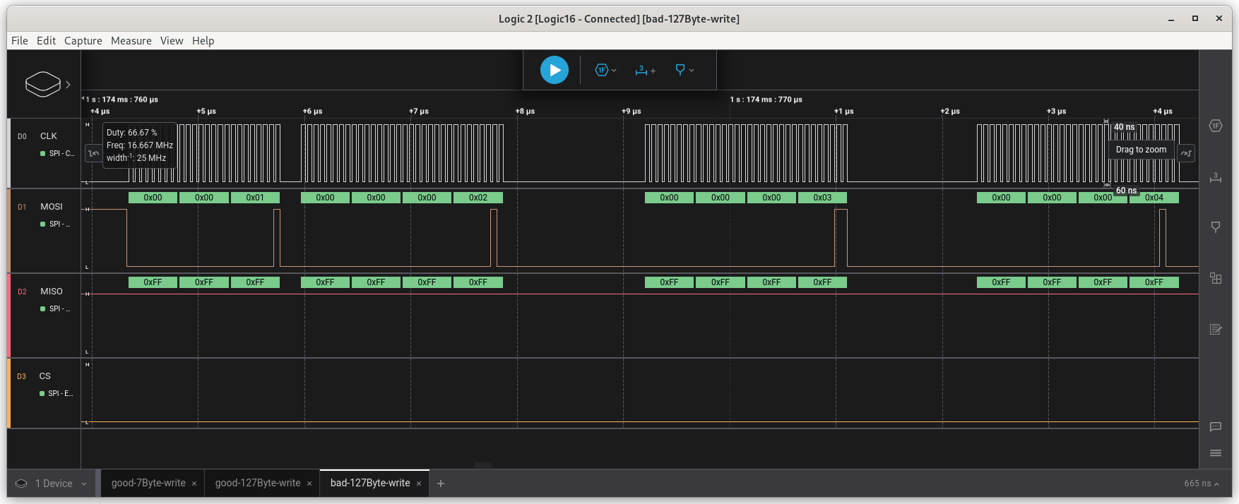 we see a 4Byte write command followed by the number of bytes to write
