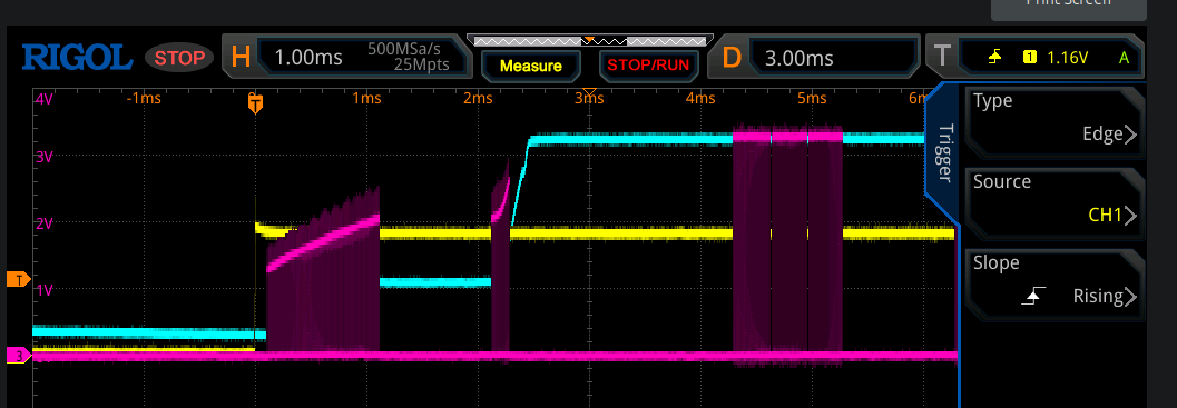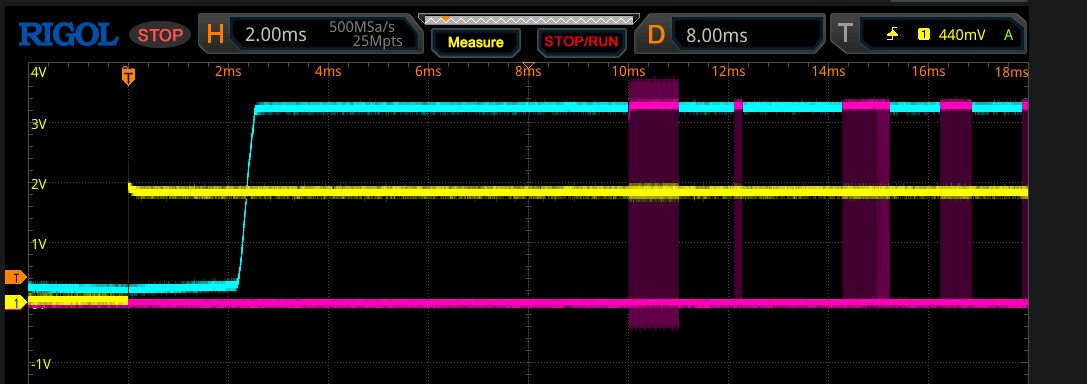 Here yellow is the load switch enable line, blue is the load switch output (3V3_SD) and purple is the SD clock line. You can see exactly 10ms delay between the load switch enable and the first clock activity.
